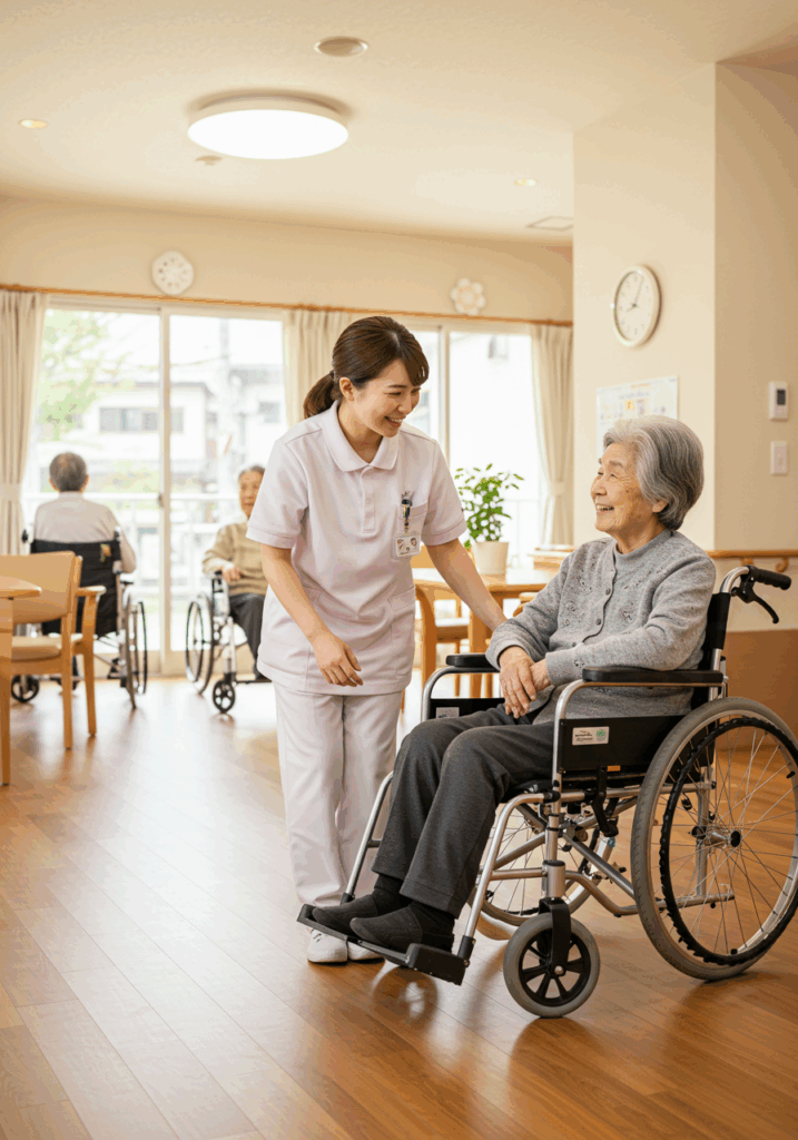 日本の介護施設の中での、温かく迎え入れてくれるようなシーン。清潔な制服を着た若い日本人の介護士が、車椅子に座った高齢の日本人女性とやさしく会話している。二人とも穏やかな笑顔を浮かべている。大きな窓から自然光が差し込み、室内は明るい。背景には、木の床ややわらかな色合いの内装、観葉植物など、日本の介護施設らしい雰囲気が広がっている。他の高齢者たちも、本を読んだり、おしゃべりを楽しんだりして、穏やかな時間を過ごしている。全体として、落ち着いていて、安全で、親しみやすい雰囲気が感じられる。―― 写実的な写真スタイル、高解像度、やわらかな自然光。