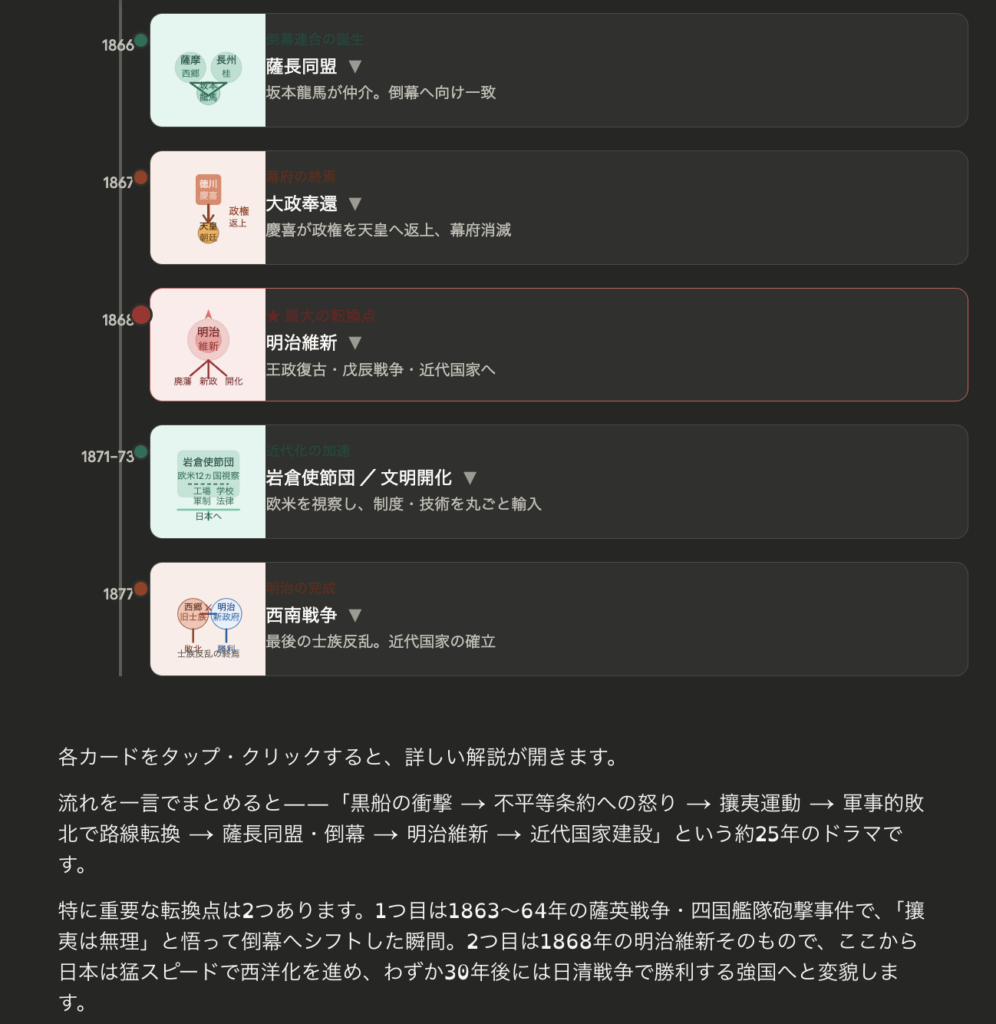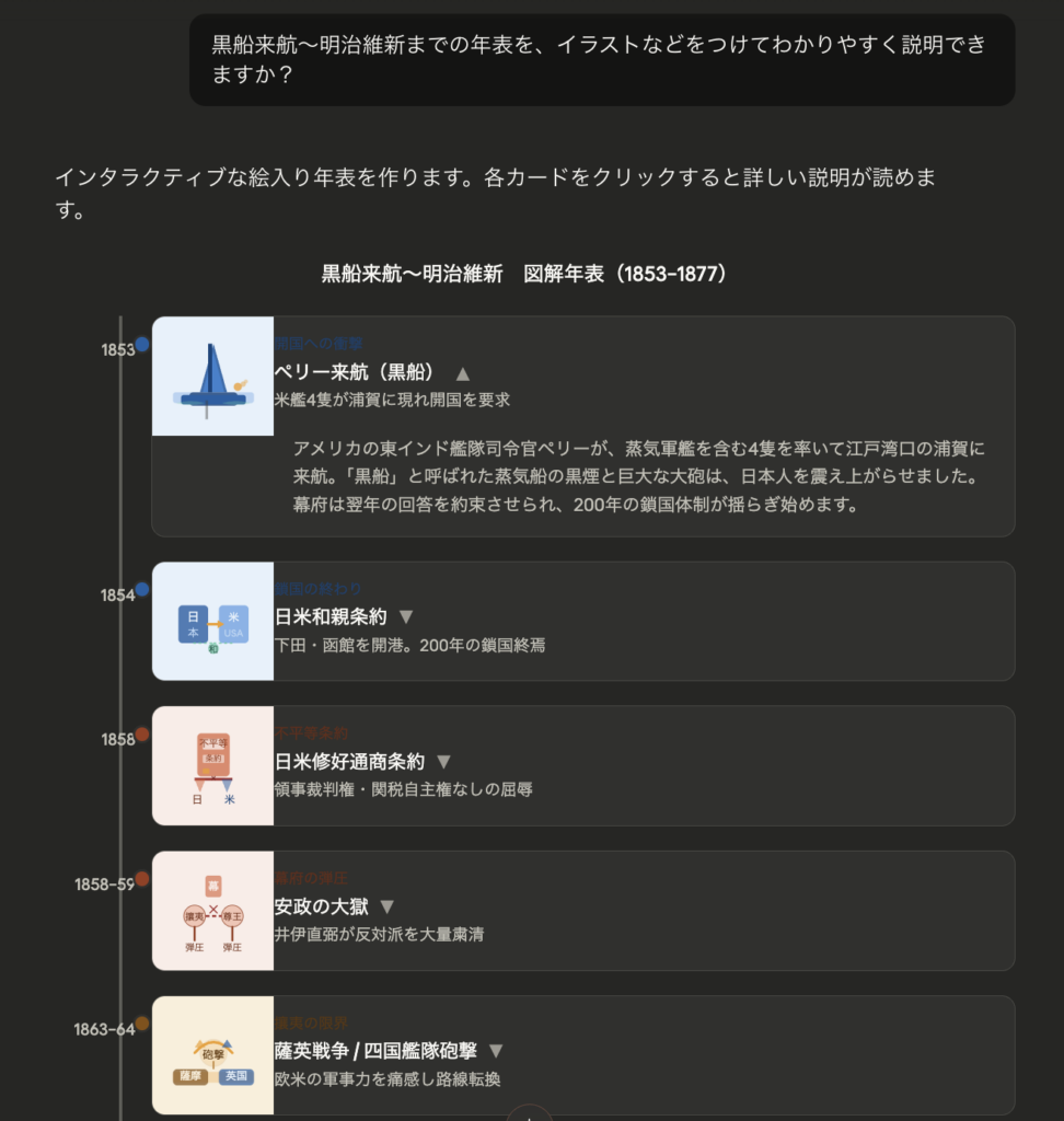 ペリー来航〜明治維新までの年表ですが、他にも世界史と比較してと伝えた場合でも視覚化可能でした。視覚的なアプローチのほうが覚えやすい方もおられるので、それぞれの覚えやすい方法に合わせやすくなったように思います。