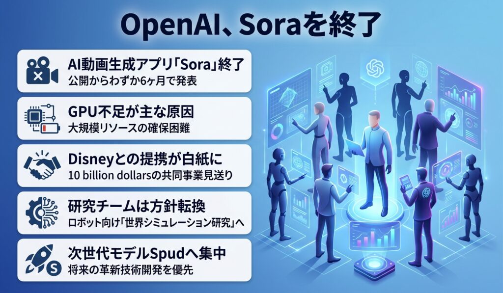 エンタープライズ市場でDisneyとの10億ドル規模の提携契約も同時に破棄されており、OpenAIの大きな戦略転換を象徴する出来事となっています。